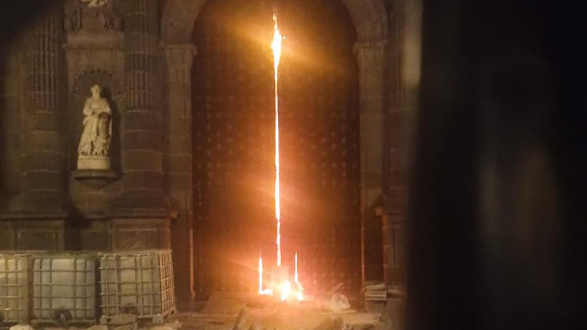 Prenden fuego a puerta de la Catedral de Puebla y se dan a la fuga