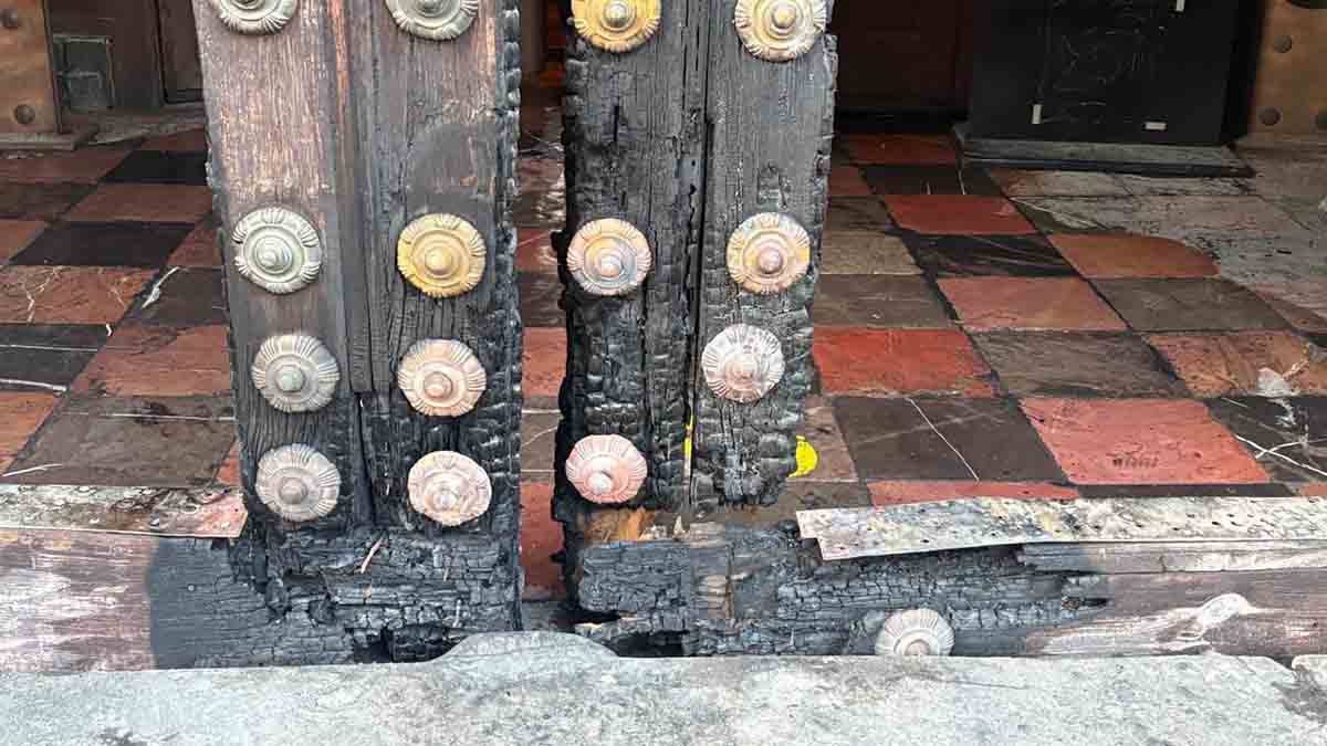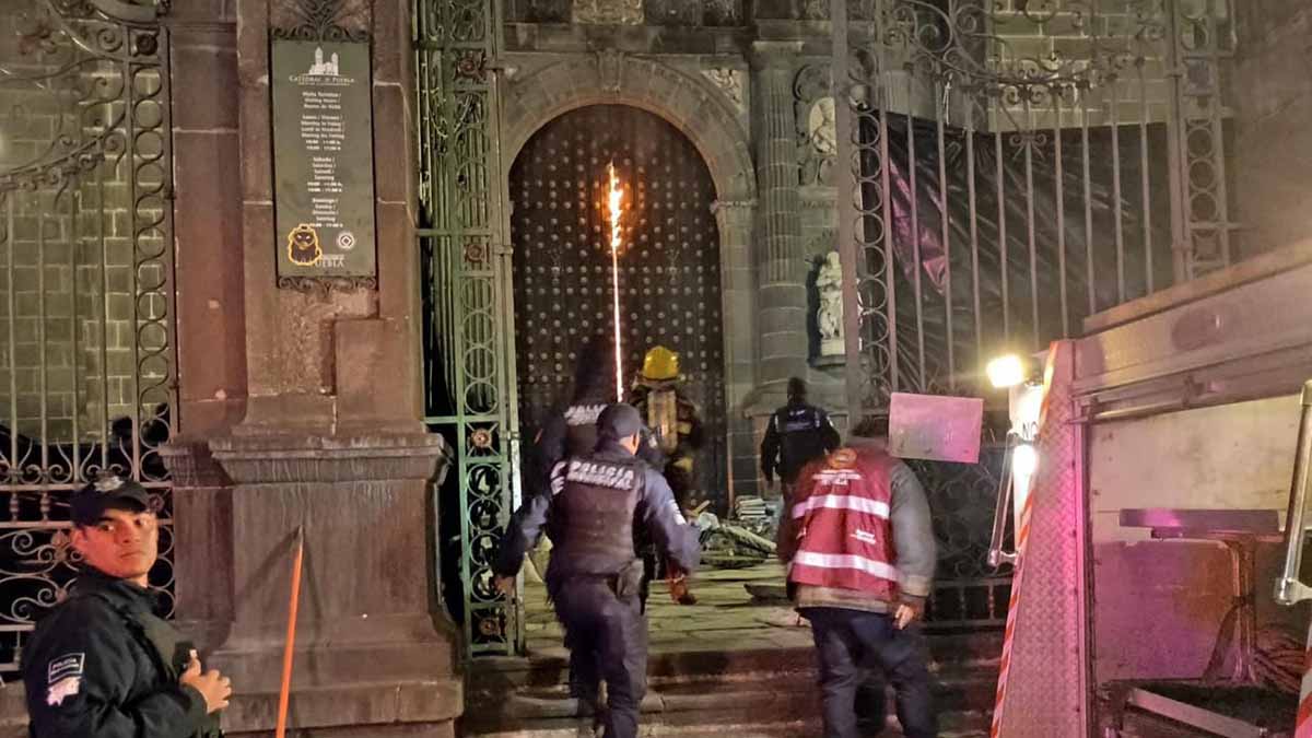 Autoridades evalúan daños tras incendio en puerta de la Catedral de Puebla